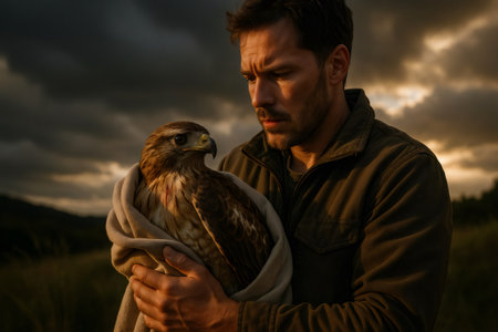 Veterinarian holding a rescued hawk wrapped in a cozy blanket, surrounded by the warm glow of a sunset and dramatic evening sky