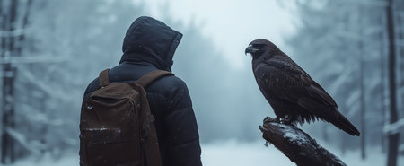 A person with a backpack stands in snow, observing a majestic bird in a winter forest