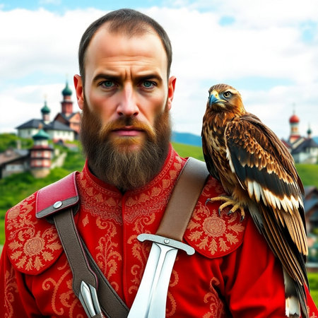 Bearded medieval warrior with golden eagle on the background of the ancient fortress