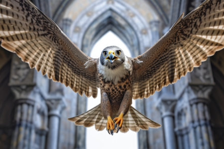 A kestrel diving from a building ledge to catch its prey, blending with urban life like a phantom