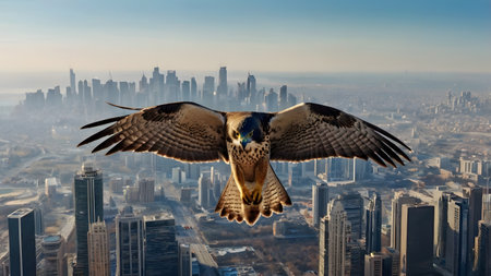 A powerful hawk glides gracefully through the sky, its wings spread wide, as it overlooks a bustling city filled with towering skyscrapers..