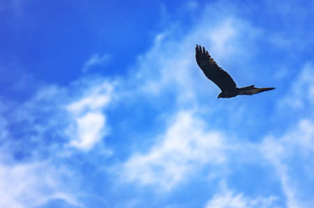 Black Kite, Milvus Migrans, Spread Wings Flying in the Blue Sky with White Clouds. Freedom, Travel Concept
