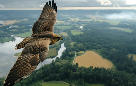 Majestic hawk soaring high, detailed wings against lush landscape and cloudy skies