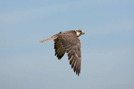 SAKER FALCON falco cherrug, ADULT IN FLIGHT AGAINST BLUE SKY