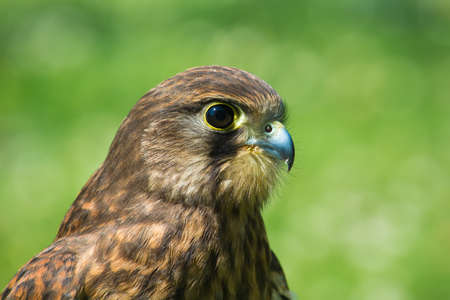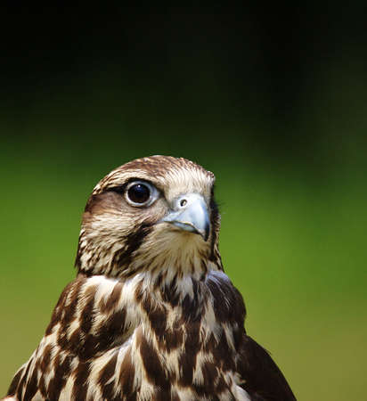 The saker falcon (Falco cherrug) up to close. The saker falcon portrait. Green background.