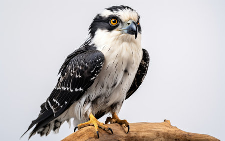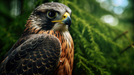 A falcon sits majestically on a branch amidst a misty forest backdrop. Its intricate feathers and piercing eyes reflect the serene beauty of wildlife in nature.