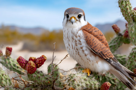 American kestrel bird standing on a cholla cactus in the desert wildlife environment