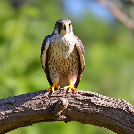 Photo of a Peregrine Falcon standing on a fallen tree branch at morning