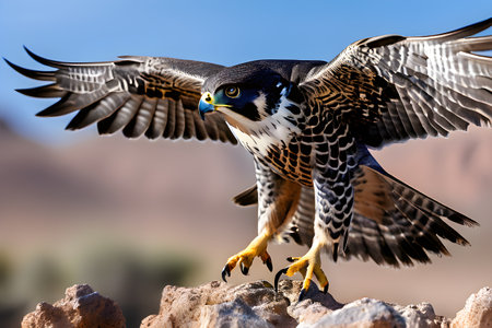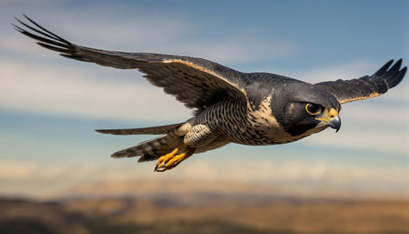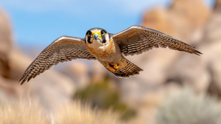 Peregrine falcon in flight with wings spread over rocky landscape. Concept of majestic birds, wildlife adventure, nature exploration, aerial grace.