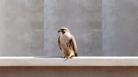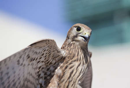 Kestrel bird of prey perched on a wall in the city