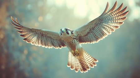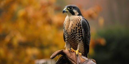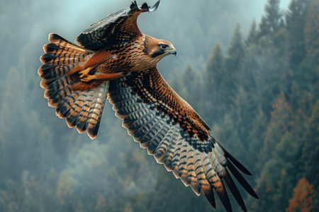 A majestic falcon spreads its wings in flight through the autumn forest