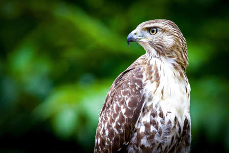 Falcon bird predator, close-up. Red Tailed Hawk portrait on dark green background with copy space.