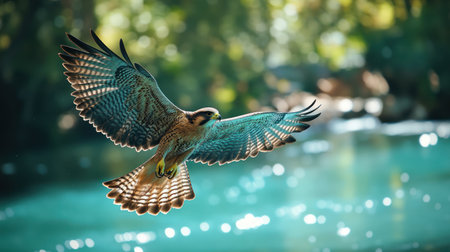 A close up cinematic view of falcon flying low above vibrant teal lake with crystal clear water reflecting soft sunlight and bright green forest