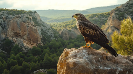 A Black Kite perched on a rocky outcrop, with Monfrage's vast canyons and forests forming a dramatic backdrop.