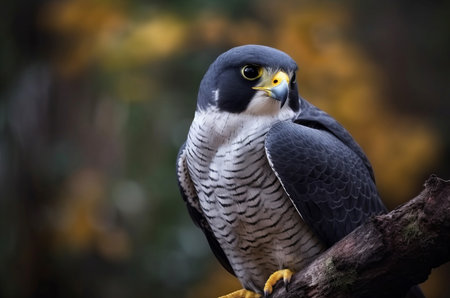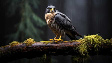 Peregrine falcon raptor sitting on tree branch. Wild predator bird with dark plumage and black beak. Generate ai