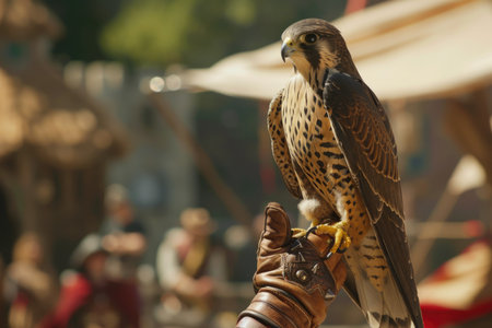 A captivating image of a falconer with a hooded falcon perched on their gloved hand, set against a backdrop of a medieval fair, representing the ancient practice of falconry and bird training. --chaos 10 --ar 3:2 Job ID: 2a9349b8-7c55-4b85-bc5c-a80de8f2b6ae