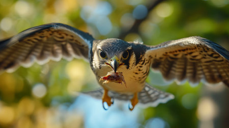 A stunning bird of prey captures attention in mid-flight against a backdrop of colorful autumn foliage, showcasing the beauty of nature and wildlife.