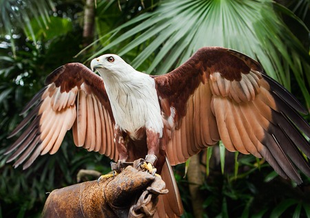 Imperial eagle landing on falconers hand in Crimea