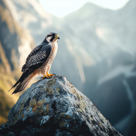 A peregrine falcon stands proudly on a rocky surface, overlooking a stunning mountainous landscape bathed in warm, golden light. The tranquil setting showcases nature's beauty.
