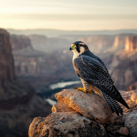A peregrine falcon stands alert on a rocky ledge, surveying the breathtaking canyon landscape beneath a warm, golden sunset. The scene captures the beauty of nature.
