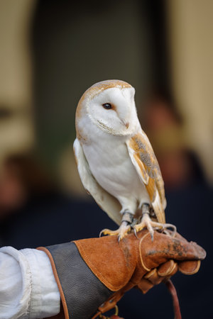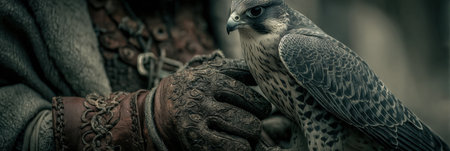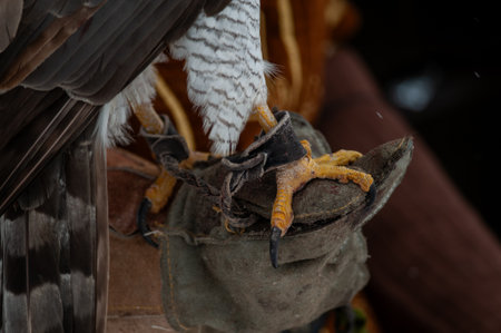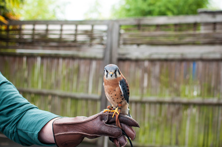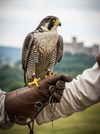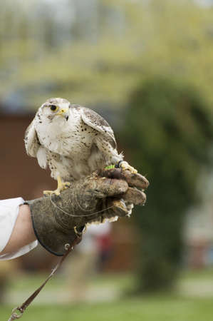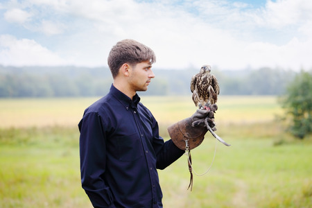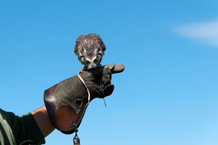 Young falcon training for falconry sits perched on the trainer\'s gloved hand
