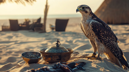 A majestic falcon stands on the beach at sunset, surrounded by traditional artifacts. This serene scene captures the beauty of nature and culture.