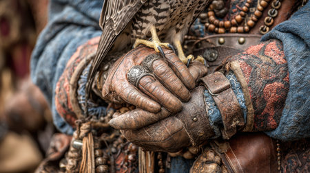 A skilled hunter in traditional attire holds a falcon in a misty dawn forest, capturing a moment of focus and connection.