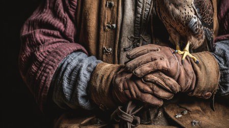 Falconers hands grip the leather glove tightly while a majestic falcon rests calmly, showcasing an ancient hunting method at the outdoor gathering.