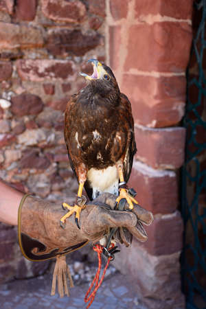 Harris Hawk standing on a handlers hand in the castle courtyard, Silves, Portugal, Europe.