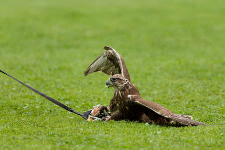 Falcon is fed on the leather glove by a falconer, a small but fast hunting bird during training, copy space, selected focus