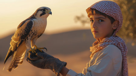 Portrait of a young boy wearing traditional Middle Eastern clothing and holding a falcon against the backdrop of a stunning desert sunset landscape in the Middle East