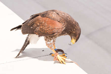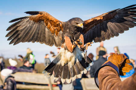 Harris hawk (Parabuteo unicinctus) landing in an falconry glove in an exhibition