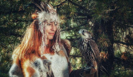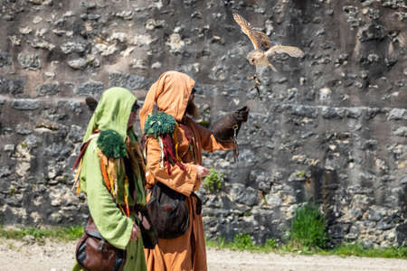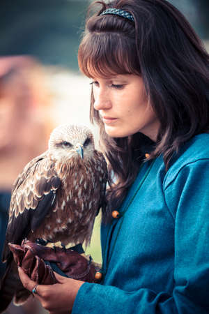 MOSCOW, RUSSIA - JUNE 23, 2013: Medieval falcon hunter girl in traditional dress during the great international yearly festival of historical reconstruction Times and Epochs