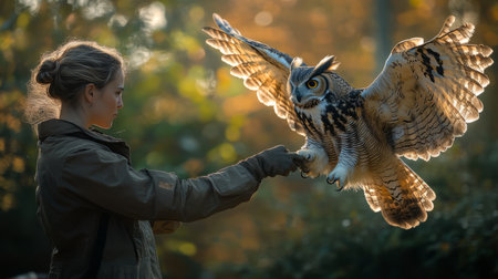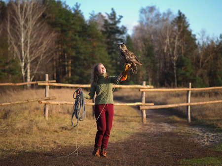 Girl trainer holds an owl on her hand. Autumn background for lettering.