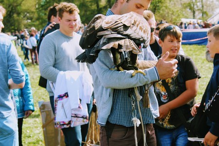 September, 16 2017, Tula, Russia - The International Military and Historical Festival Kulikovo Field: eagle sitting on falconry glove.