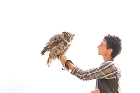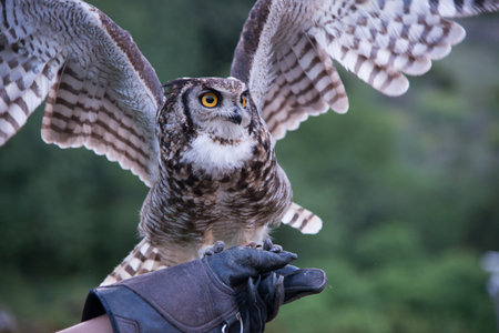 virginian owl virginian eagle owl Bubo virginianus close-up on a falconer's glove hunter. High quality photo