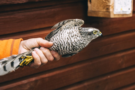 Eurasian sparrowhawk or Accipiter nisus in hand in Fringilla field ornithological station. in the Curonian Spit National Park. Kaliningrad region. Russia
