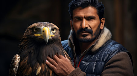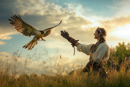 A skilled falconer showcases the bond between human and bird of prey, illuminated by golden sunset light. Generative AI