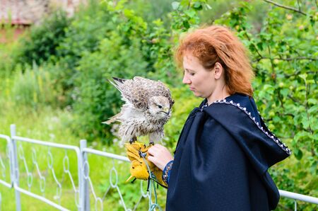 Trained falcon sitting on woman hand and looking around at summer historical festival. Falconry, wildlife, reenactment and hunting concept