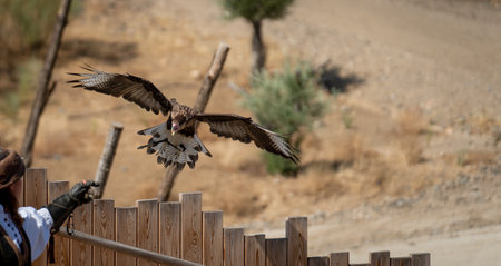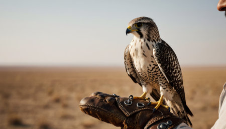 A falcon on falconer;s glove, shot in a middle eastern Arabian desert location.