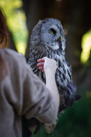 A large bearded owl sits on the hand of his mistress. Walk in the park, girl stroking an owl