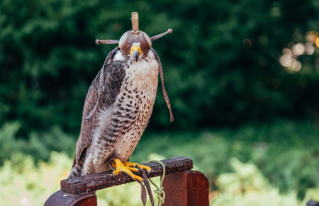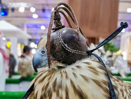 Close up portrait of a peregrine falcon with leather hood. Eyes of a bird of prey on falconry closed hood.