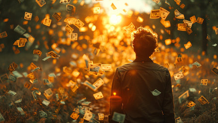 Young man in the forest with flying dollar banknotes. Money rain.