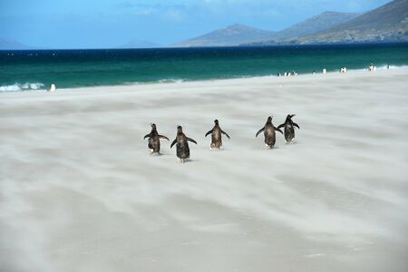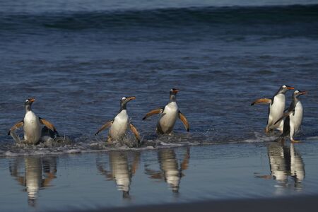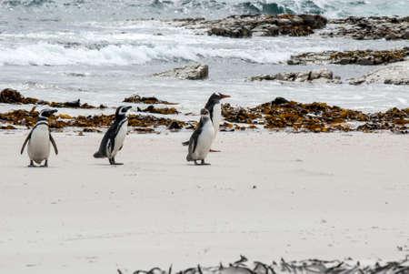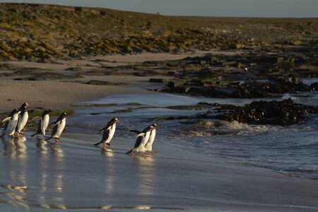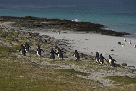 Gentoo Penguins (Pygoscelis papua) coming ashore after feeding at sea on Sea Lion Island in the Falkland Islands.