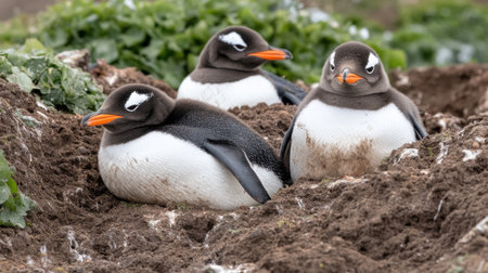 A serene scene featuring three gentoo penguins resting in their natural habitat. Surrounded by lush greenery, these charming birds symbolize wildlife's beauty and tranquility.