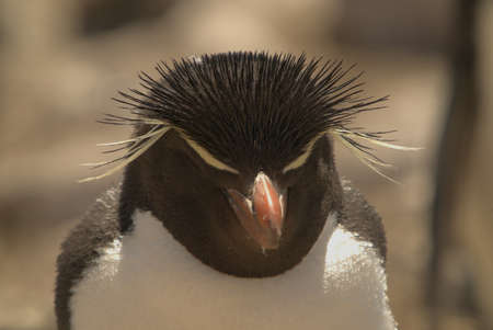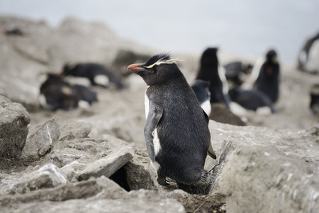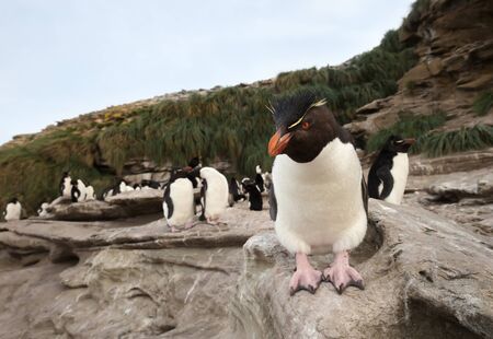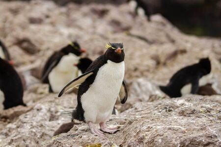 Close up of Southern rockhopper penguin (Eudyptes chrysocome) standing on a rock, Falkland Islands.