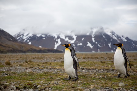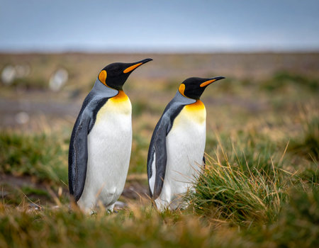 King penguins (Aptenodytes patagonicus) standing on the grass, Falkland Islands.