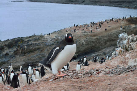 Gentoo penguin near the ocean water in Antarctica. Close-up