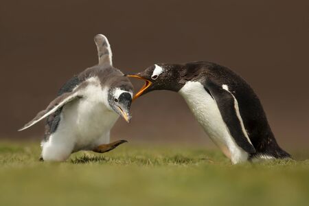 Close up of Gentoo penguin yelling at a chick for a poor behavior, Falkland Islands.