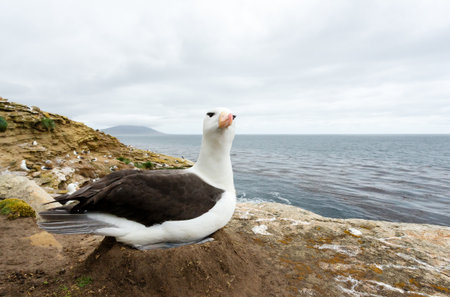 Close-up of a Black-browed Albatross sitting on a mud pillar nest in Falkland Islands